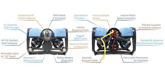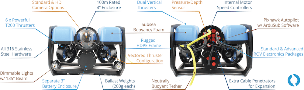 6 T200 Thrusters and Basic ESCs for a high thrust-to-weight ratio